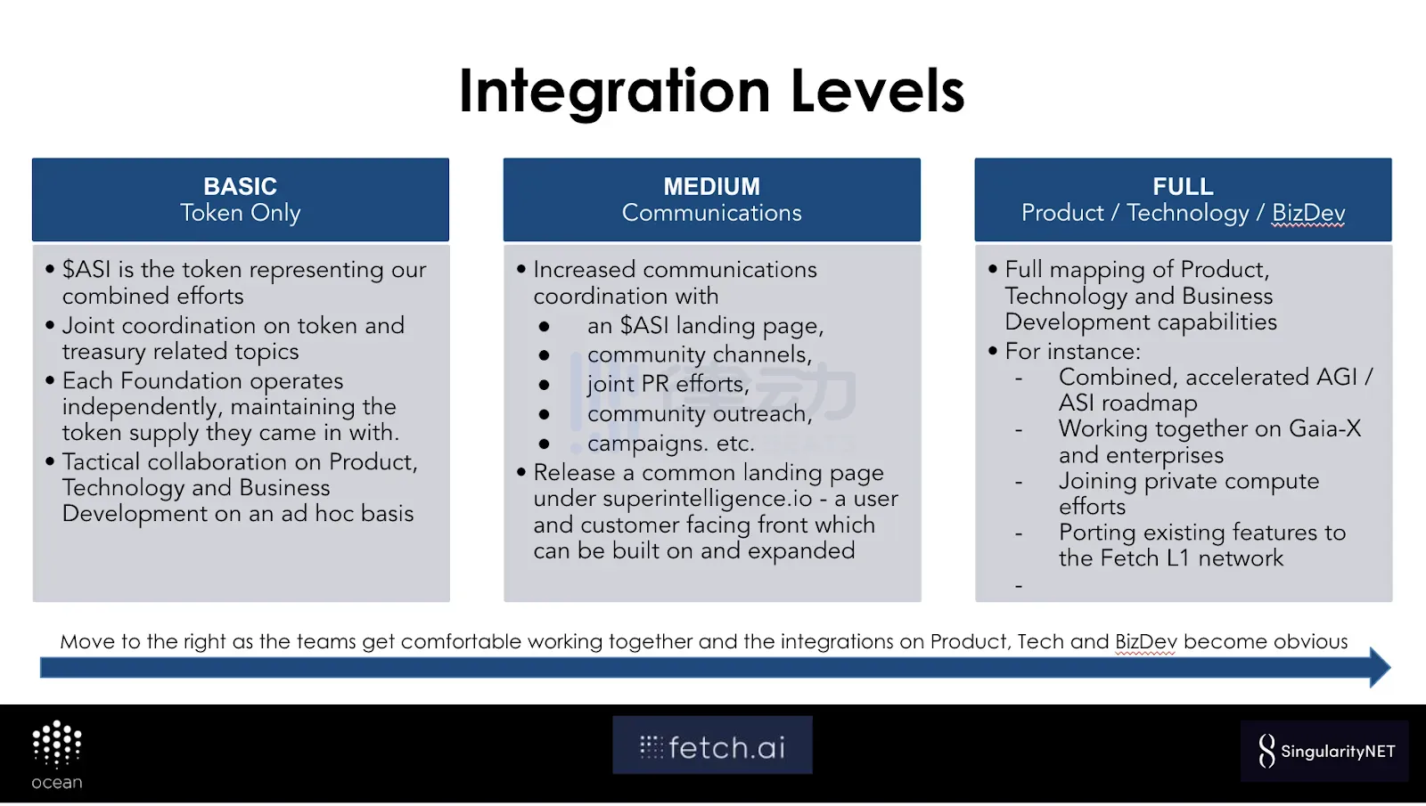 据介绍,Fetch.ai 的代币 $FET 将以 1:1 的比率转换为 $ASI,SingularityNET 的 $AGIX 和 Ocean Protocol 的 $OCEAN 将以约 1 : 0.433 的比率转换为 $ASI。