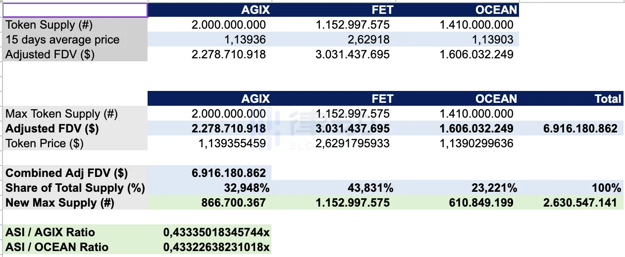 $FET 作为联盟的基础代币,将直接更名为 $ASI,并将额外铸造 14.8 亿个代币,其中 8.67 亿 $ASI 分配给 $AGIX 持有者,6.11 亿 $ASI 分配给 $ OCEAN 代币持有者。$ASI 代币的总供应量将为 26.3 亿个代币,根据 3 月 26 日的当日价格估算,$ASI 的 FDV 总额将为 76 亿美元。