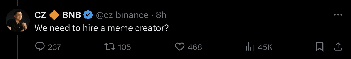 推文的底下 CZ 与社群的互动一片祥和,似乎将身上的重担放下后,CZ 拥有了轻鬆的步调,社群在底下告知 CZ,现在的年轻世代都靠迷因来学习了,对此 CZ 回覆「那我们是不是要聘请迷因创作者?」,看到这样的回覆,或许能够推测,这位加密巨头还是知道近期的迷因币热潮,心心念念加密货币市场吧!