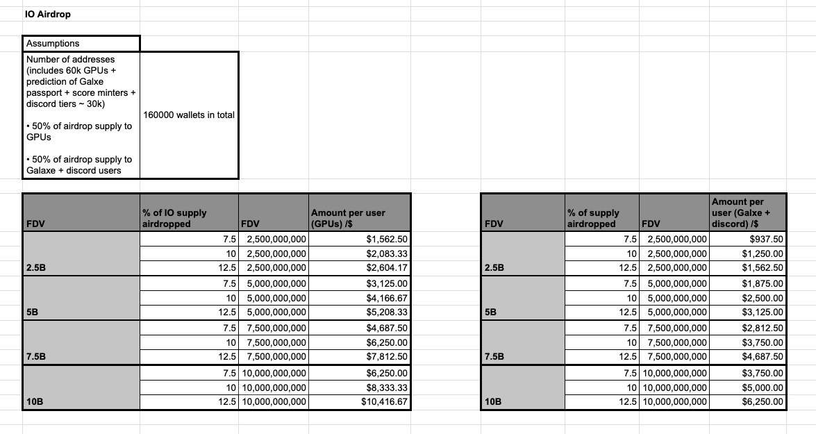 目前还没有关于 io.net 的代币经济学的信息,但作者认为就 R/R(风险回报率)而言,该代币是最有利可图的项目之一。下图为加密 KOL Aylo 关于 io.net 的空投规模和市值分析,值得参考和借鉴。