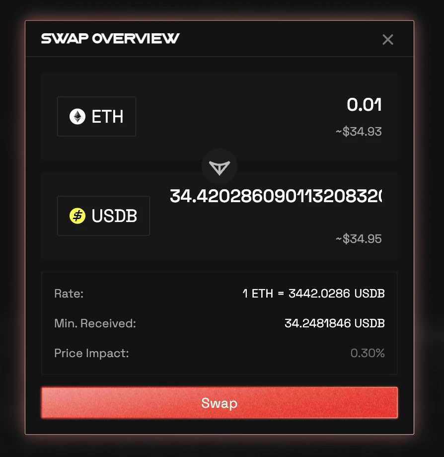“现货交易所”中,以 Blast 生态最常用的 Thruster Finance 为例,只需在 ETH 和 USDB 之间小额互换一笔,即可完成任务要求。