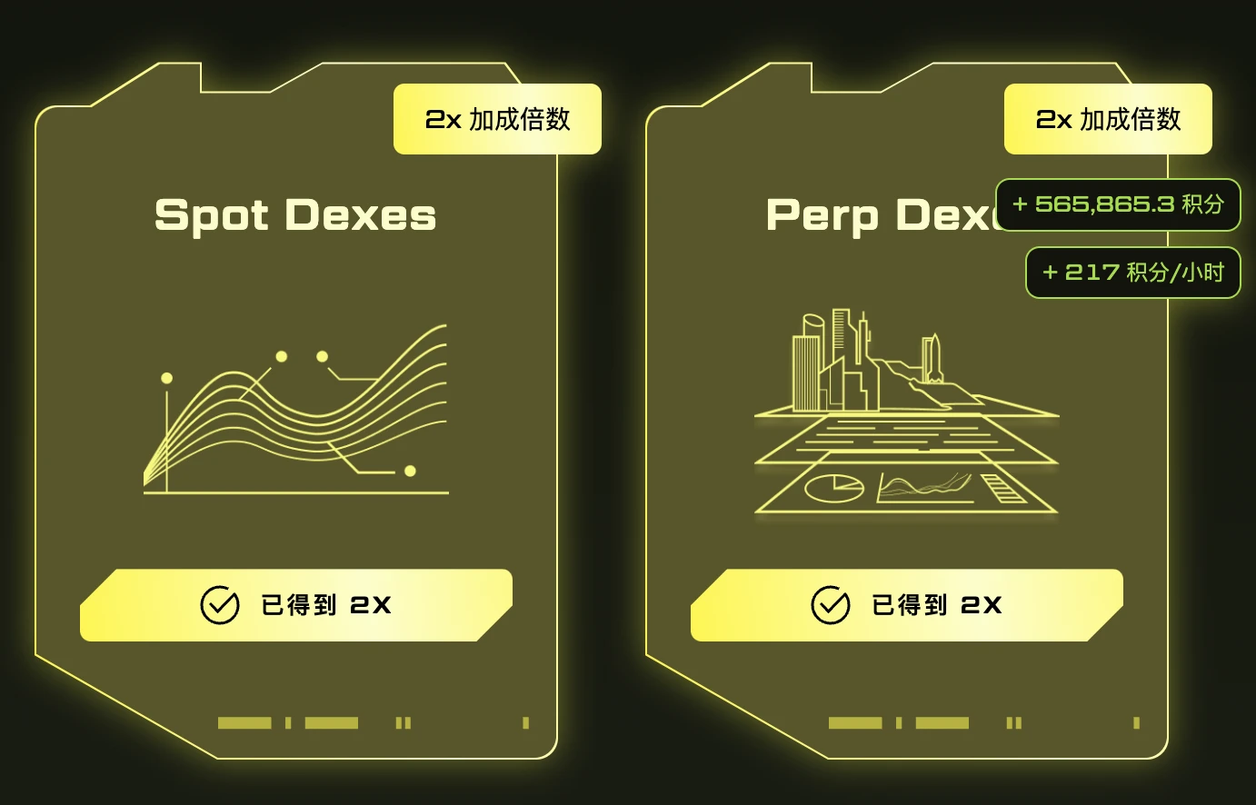 当前阶段, 用户可通过 官网 内的“加成倍数”主页处的 “现货交易所”及“衍生品交易所”板块交互指定项目,继而一次性获得大量积分,并激活后续的积分增长倍率加成 —— 以笔者当前 75 万的总积分以及 55/h 的增长速率为例,完成任一板块任务后继可一次性获得 14 万积分(约占总积分的 18.8% ),并将积分增长速度翻倍。