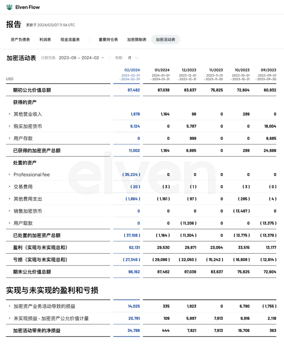 汇总报告期内加密资产持有量的活动变动,包括增加(及导致增加的活动描述)、处置、盈亏。