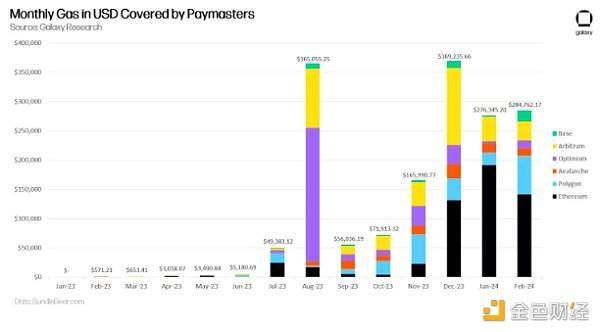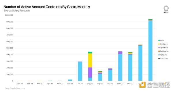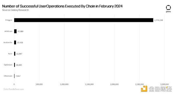 根据 Dune 的数据,截至 2024 年 3 月 26 日,以太坊上创建的 AC 总数为 4,830 个。 自 2023 年 3 月以来,链上成功执行的 UserOps 数量为 36,332 个,同期这些 UserOps 产生的捆绑器收入约为 30.5 ETH。 在交易费用相对低于以太坊的其他协议上,用户操作活动相对较高,尤其是在 Polygon 上。 见下图: