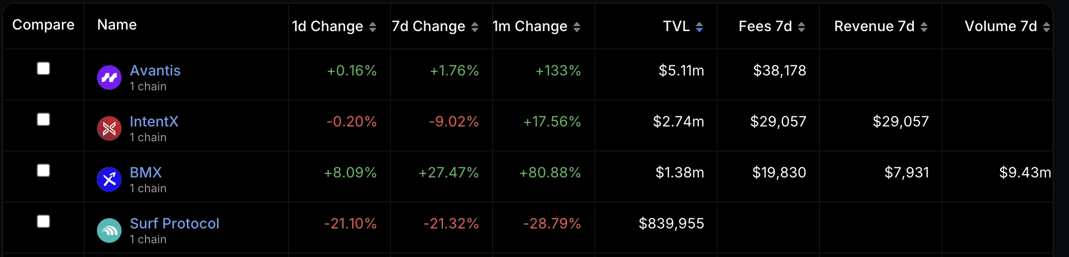 目前 Base 生态衍生品协议总 TVL 为 1200 万美元,其中,Avantis、IntentX、Morphex(原 BMX)TVL 分别为 511 万美元、 274 万美元及 138 万美元。其中, 基于预言机的合成衍生品协议 Avantis 于今年 2 月,在 Base 链上完成主网发布,其协议允许用户可以使用杠杆交易加密货币和现实世界资产,暂时排行第一。