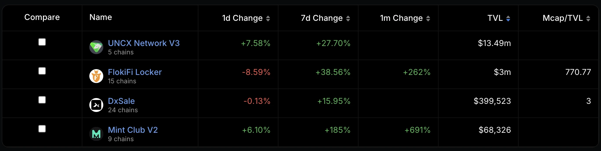 Base 生态的 Launchpad 项目数量比较有限,且尚未跑出知名的优质项目。三者 TVL 相对较小,UNCX 约为 1300 万美元,Floki 约为 300 万美元, DxSale 则仅有 39.9 万美元。