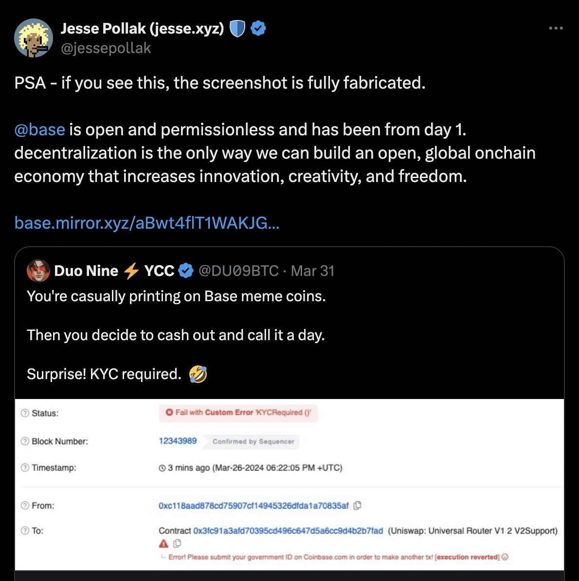 尽管 Base 生态发展日益完善,但正如 Base 协议负责人 Jesse Pollak 多次强调的那样, “ Base 是一个开放且无需许可的网络” ,因此该生态安全事件、跑路项目也不在少数,甚至 Jesse 本人参与购买过的 Base 生态 Memecoin 项目也曾 Rug 跑路,让人哭笑不得的同时,也不得不提高警惕,以下为 Base 生态部分安全事件简介: