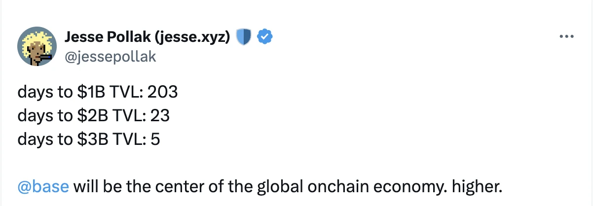 纵览 Base 的发展,生态 TVL 超 10 亿美元总共花费 203 天;生态 TVL 超 20 亿美元,花费时间缩短到了 23 天;而 TVL 从 20 亿美元增长到 30 亿美元,Base 生态仅仅花了 5 天时间,看得出来,近期 Base 生态的发展呈加速度的态势,而且随着时间的推移,从以太坊生态和 Solana 生态迁移过来的资金和用户还将继续增长。不仅如此,根据 Base 协议负责人 Jesse Pollak 的 消息 ,Base 生态后续的 gas 费用还将进一步降低,足以支撑更加丰富多元的生态建设,在 DeFi 和 Memecoin 之外,寻求更多的可能性。