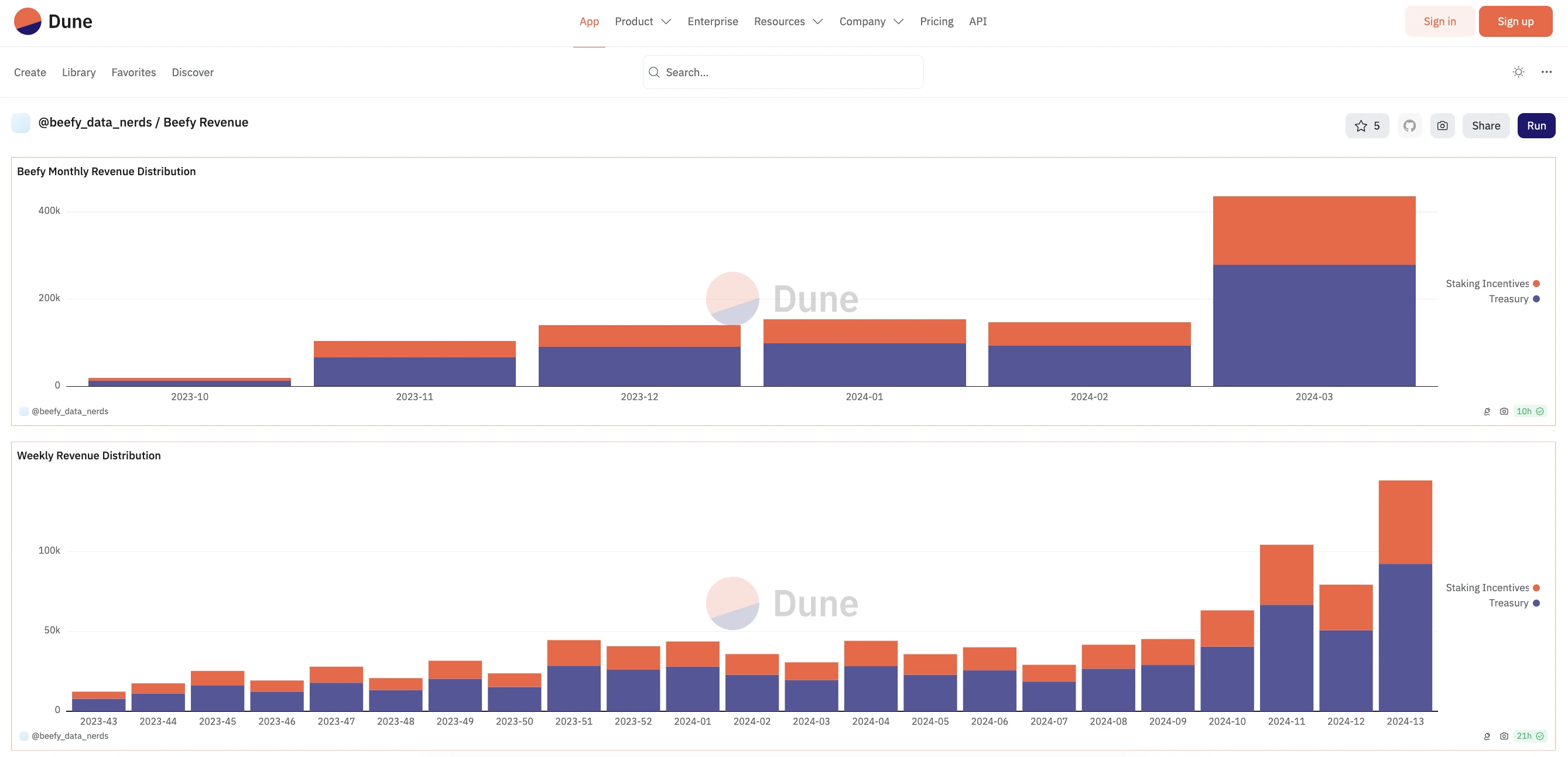 其中 Beefy 目前 Base 生态 TVL 约 5200 万美元,排名第一。且根据 Dune 数据 ,在过去的 3 月,Beefy 协议的总体质押激励和国库增长势头强劲,接近 2 月份总体数据的 3 倍。ACryptoS 则是以 DAO 组织运作的收益聚合器,在 Base 生态的 TVL 仅有 124 万美元左右;Harvest Finance 情况类似,其 Base 生态 TVL 甚至不足 100 万美元,仅为 68 万美元。