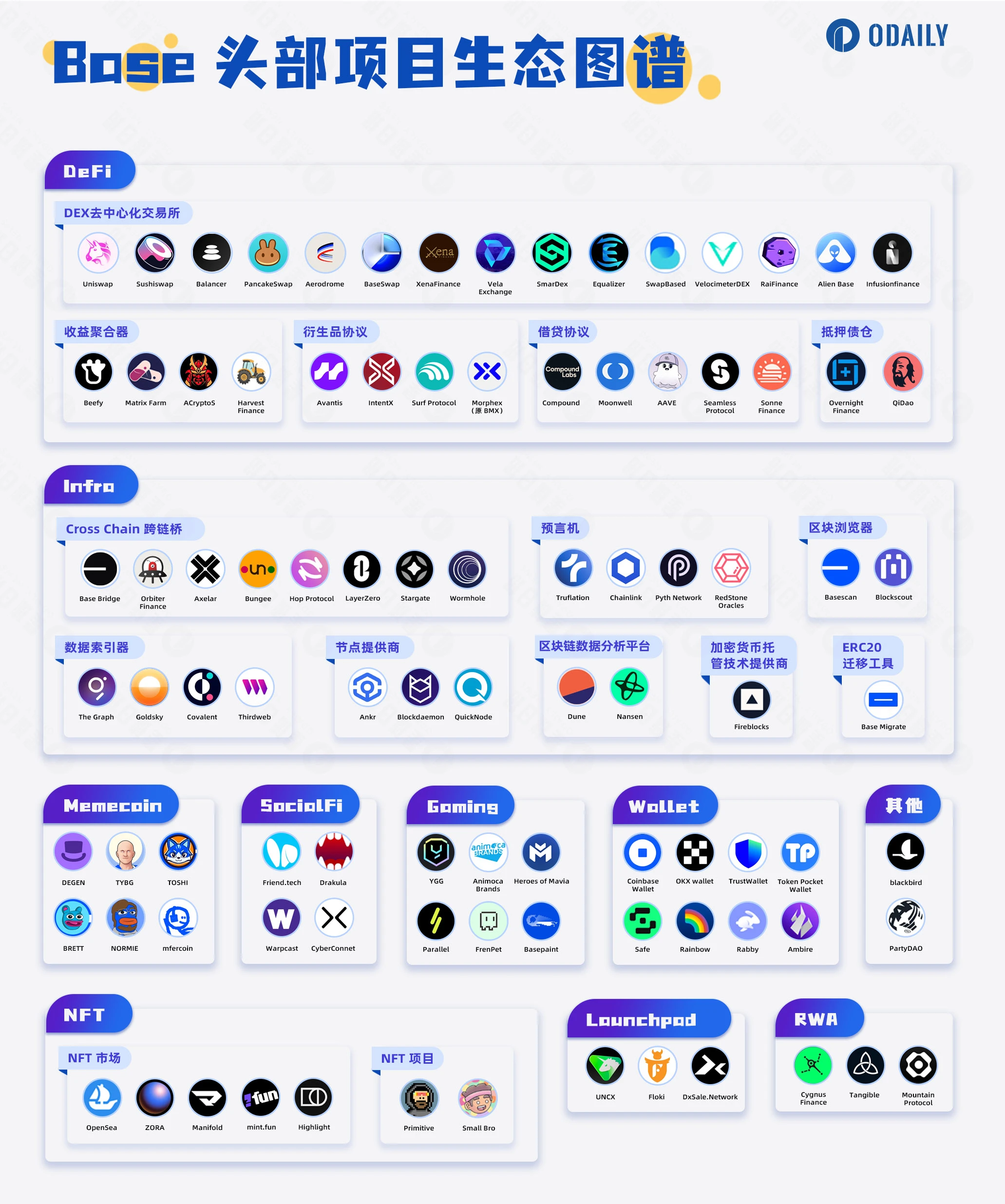 自 2024 年 3 月开始,承接 Solana 生态的 Memecoin 热潮,Base 生态的众多 Memecoin 项目也再度吸引了众多关注。有鉴于此,Odaily 星球日报梳理了目前 Base 链生态的部分头部项目,供大家交流探讨。 ( Odaily 注:以下项目相关信息主要来自 Defilama,星球日报不为任何项目背书,请大家使用相关产品或平台时注意资产安全,谨慎选择投资标的。)