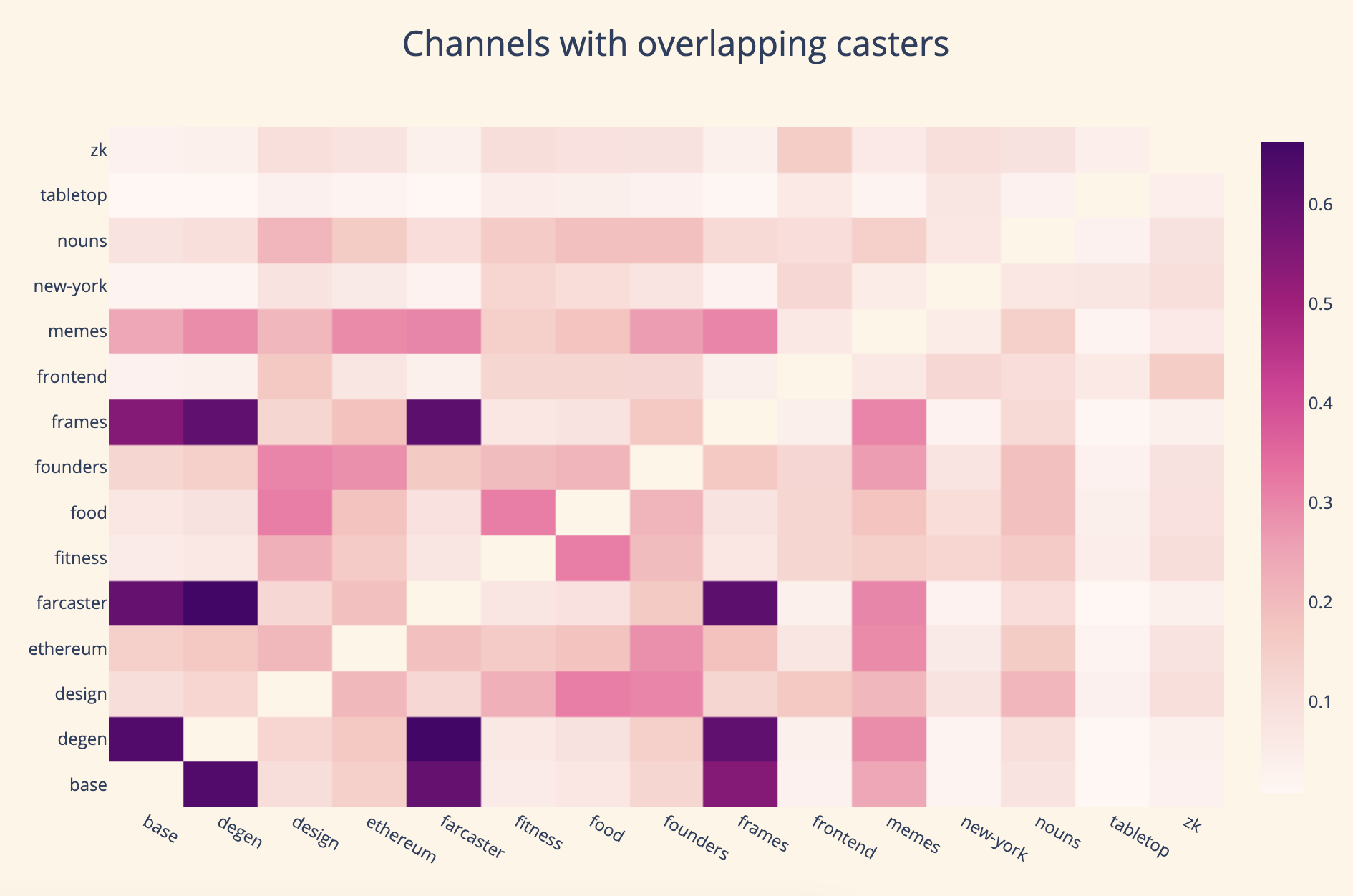 Farcaster 上排名前 15 的频道及其用户之间的重叠情况