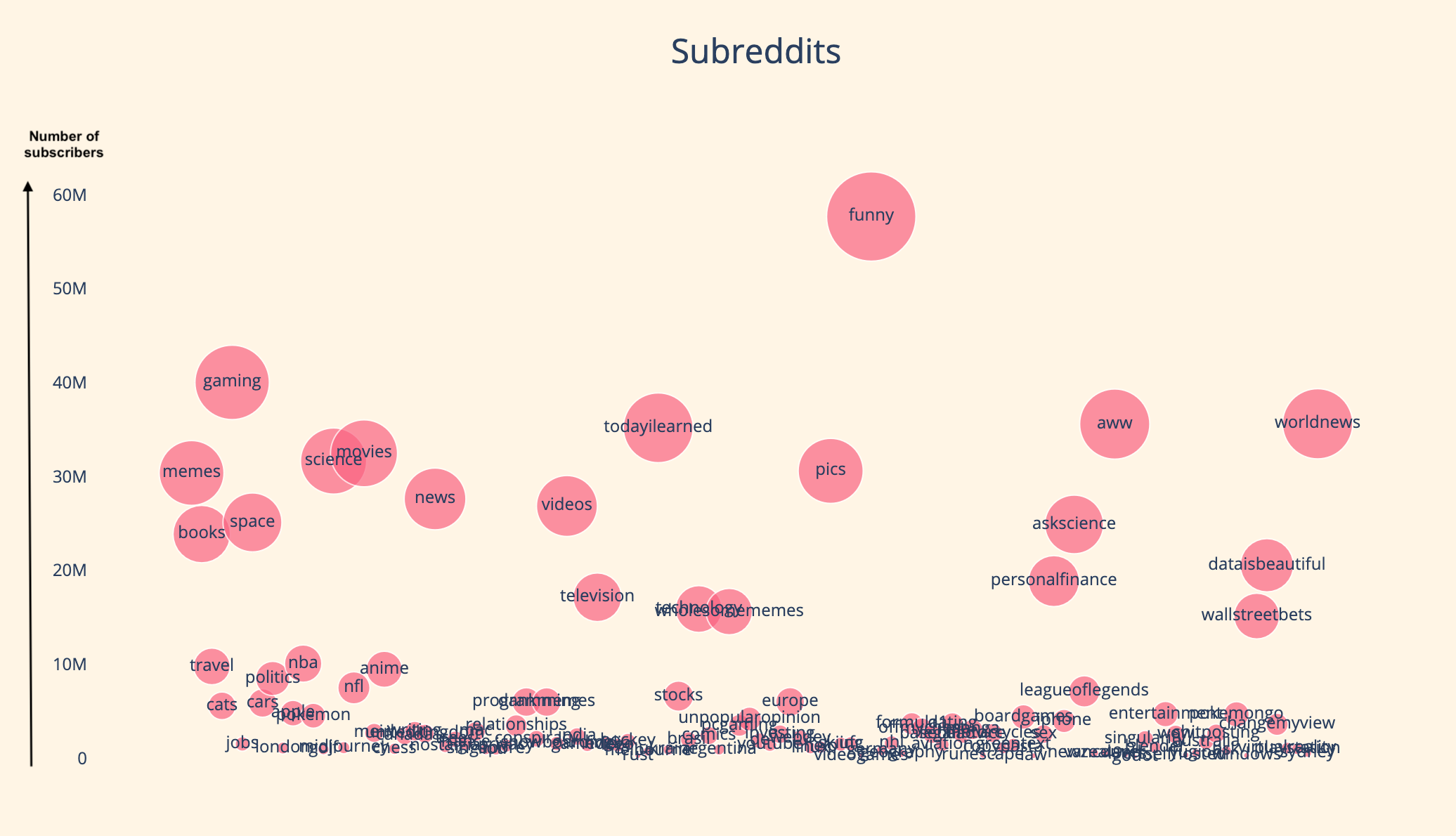 除了 funny 高于其他所有子论坛之外,您可以看到广泛的通用主题范围,所有这些主题都拥有 2000 万至 3000 万的订阅者,其中许多人是在加入 Reddit 时被自动订阅的。