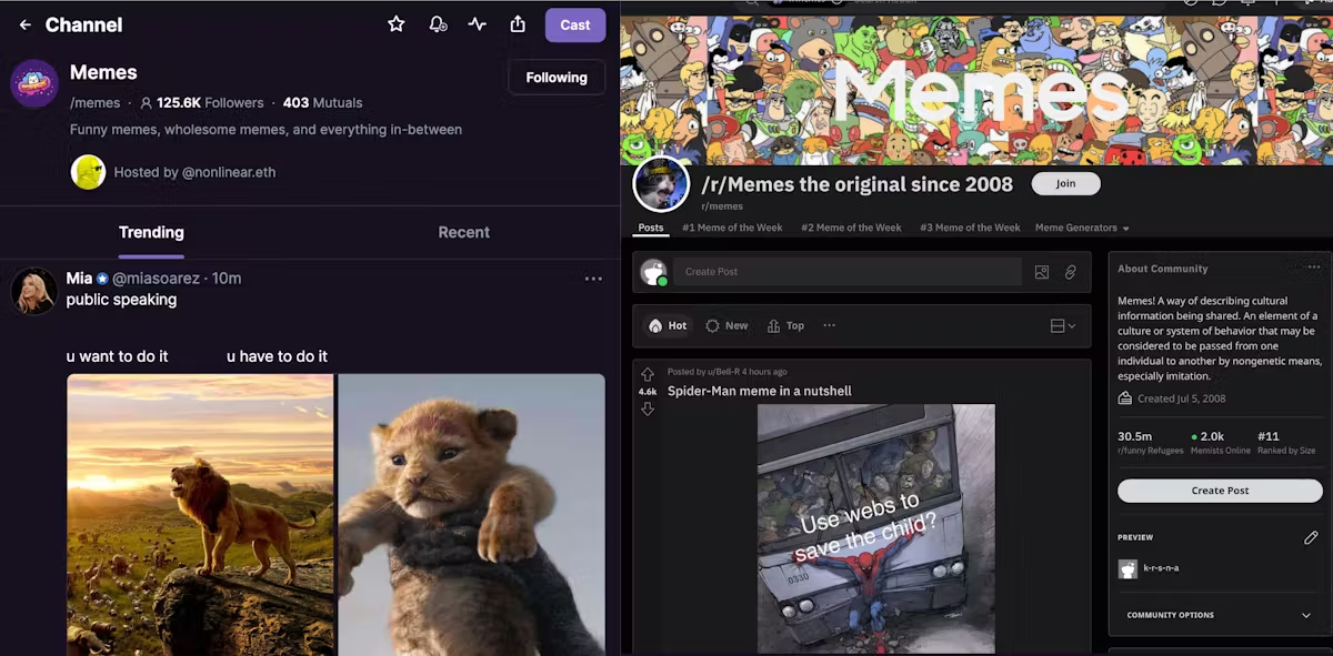 Farcaster 上的频道(左)与 Reddit 上的子论坛(右)
