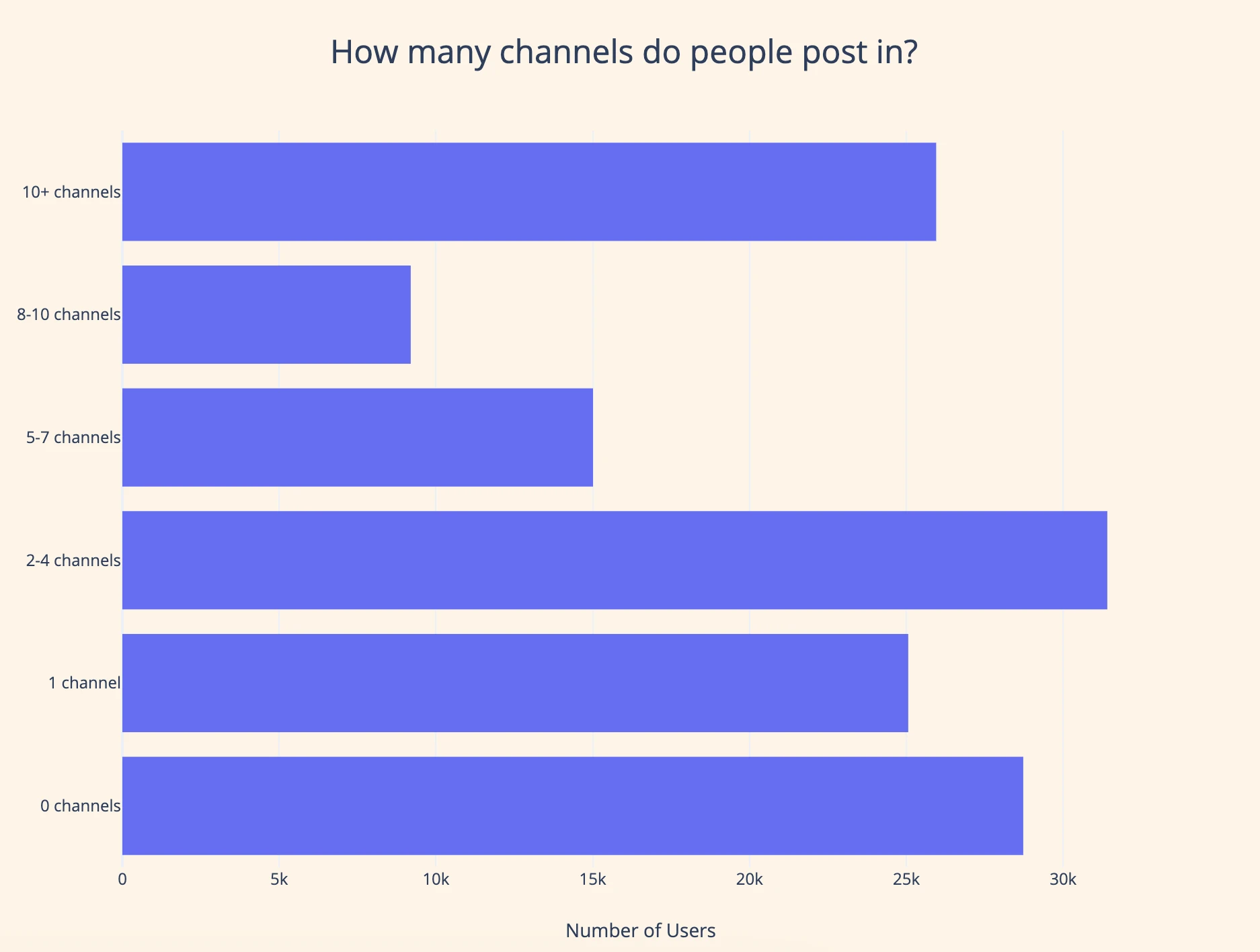 如果一个平均用户在 8 个频道上发帖,它实际上是如何分布的?根据用户发布帖子的频道数量进行分类显示了这种分布: