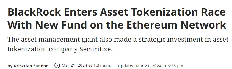 你可能已经听说了,全球最大的资产管理公司贝莱德集团几天前宣布在以太坊上推出了一个价值超过 1 亿美元的代币化基金。