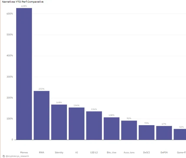 根据 Crypto Koryo 的 仪表板 ,今年现实世界资产叙事是表现第二好的叙事,胜过了人工智能。