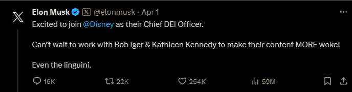 马斯克嘲讽迪士尼,发推表示「接受了一份意想不到的新工作:迪士尼首席多元化、公平和包容官(DEI)」