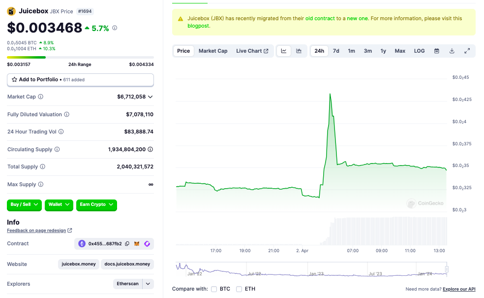 根据 CoinGecko 的数据,该协议的原生代币 JBX 飙升了 45% 以上,达到 0.0043 美元。Briliegh.eth 随后表示这是愚人节玩笑,代币价格应声回撤 25%。