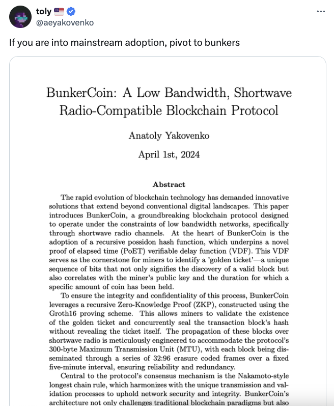 Solana 首席执行官 Anatoly Yakovenko 推出一种基于 Solana 的新代币「BunkerCoin」以此讽刺项目方蹭概念和热度不进行实质性的开发。「BunkerCoin」仅需通过无线电波进行传输,同时缝合最新技术涉及 ZkProofs,Groth16 证明和最长链规则。