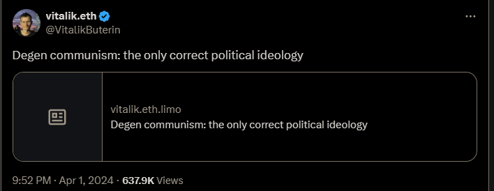 Vitalik Buterin 发布幽默的博客讽刺行业投机成风,宣称我们所有的政治意识形态包括无论是资本主义、自由主义、进步的社会民主主义都已经过时。「degen communism(投机共产主义)」,一种公开拥抱混乱的政治意识形态,是加密货币领域唯一正确的意识形态。