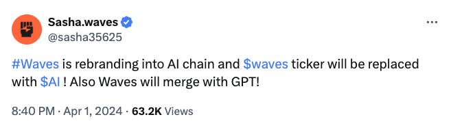 素有「俄罗斯以太坊」之称的 Waves 的创始人「Sasha」宣布该协议将与 AI 集成并用 AI 取代其开发工作,随后上涨 5% 后迅速回落到之前价格。