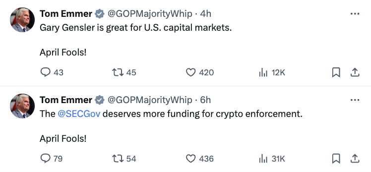 共和党多数党党鞭 Tom Emmer 发推嘲讽美国证券交易委员会,「SEC 在加密或领域应该获得更大监管权力;Gray Gensler 对于美国资本市场来说至关重要」,随后补充「April Fools!」
