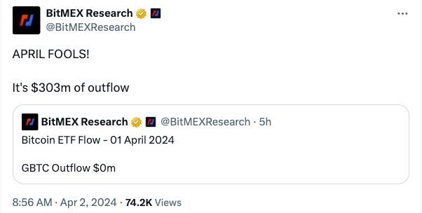 BitMEX Research 发推嘲讽灰度过去几周 GBTC 大量流出,「Grayscale Bitcoin Trust (GBTC) 的资金流出为 0 美元」。随后的澄清了这个愚人节笑话,分享了 4 月 1 日真实数据, GBTC 流出 3.03 亿美元。