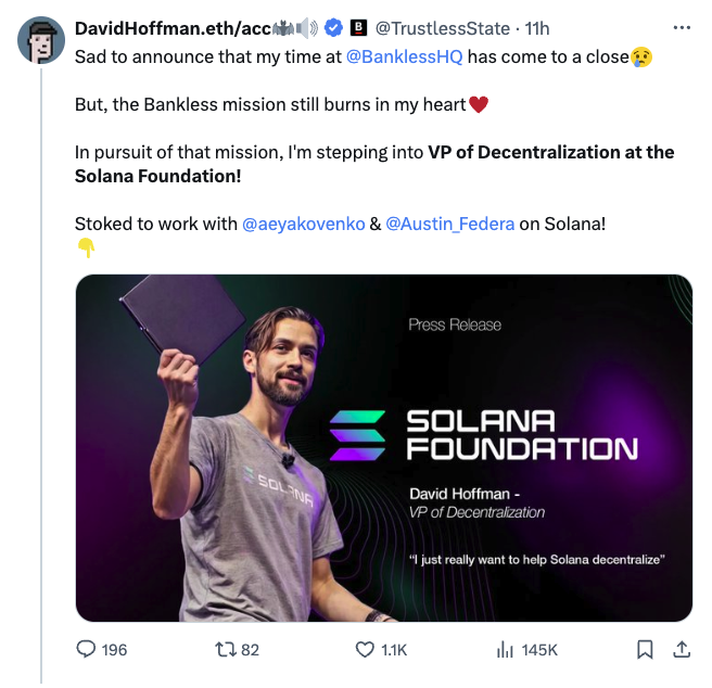 Bankless 的联合主持人和著名的以太坊极端主义者 David Hoffman 宣布「将离开以太坊生态系统,担任 Solana 的去中心化副总裁并与 Solana 基金会的 Austin Federa 和 Yakovenko 联手。」,笔者猜测 David Hoffman 可能是以此来讽刺 Solana 去中心化程度较低。