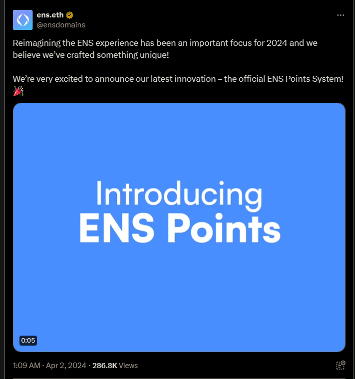 Web3 域名协议 ENS 推出积分系统 「ENS Points」,评分项目包括「出售 ENS 或域名的数量」、「投机成分」、「预言机的可靠性」、「糟糕的 Gas 体验评分」、「成为 Meme 的可能性」、「侧链适应性评分」等。