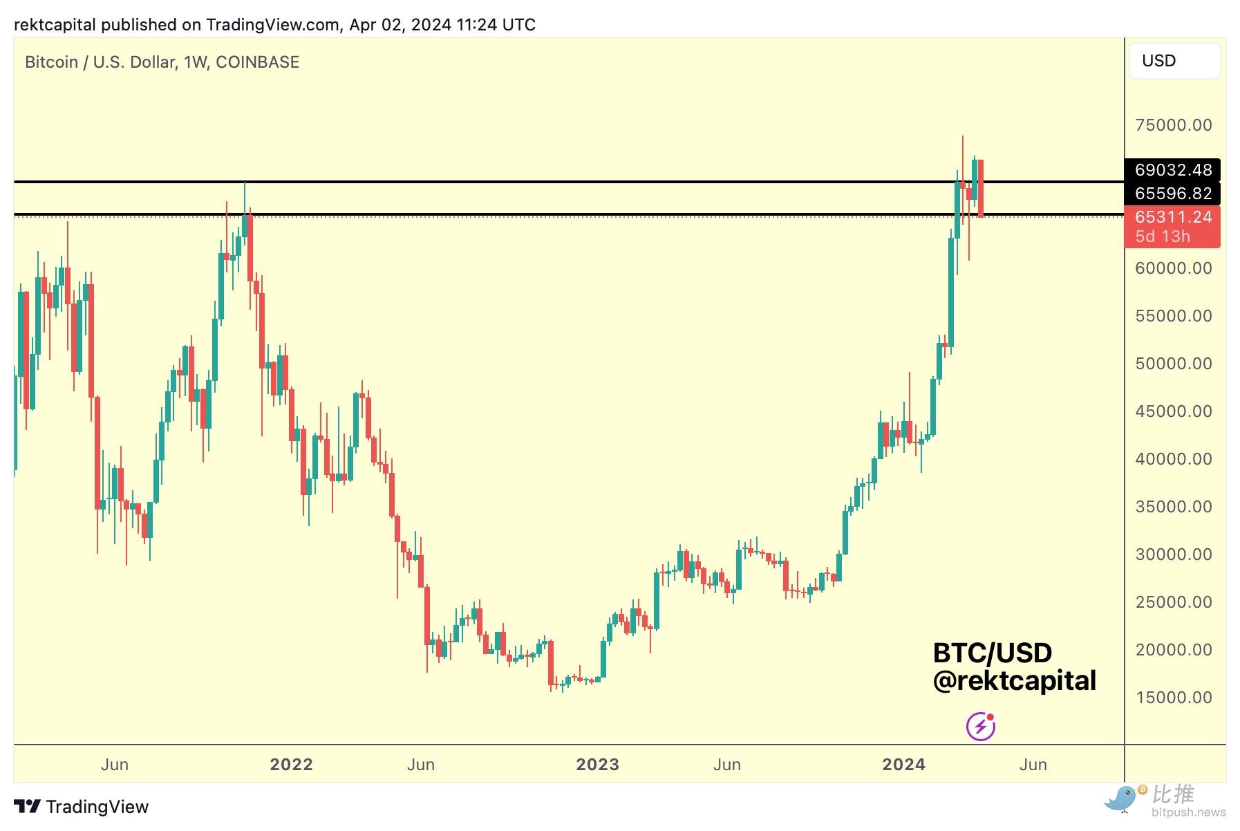 Rekt 表示:「比特币未能完成突破后的重新测试。从技术上讲,在新的每周蜡烛收盘之前,比特币仍可能恢复至约 69,000 美元的历史高点之上。」分析师补充道,比特币价格需要维持在 65,600 美元的周低点上方,以避免进一步损失。