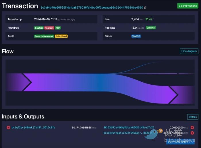 Arkham Intelligence 的数据显示,2024 年 4 月 2 日,美国政府执行了一项涉及近 20 亿美元的比特币转账,分几笔将代币转移到 Coinbase Prime 地址。转账金额为 30,174.70 BTC,在区块高度 837,413 成功处理。