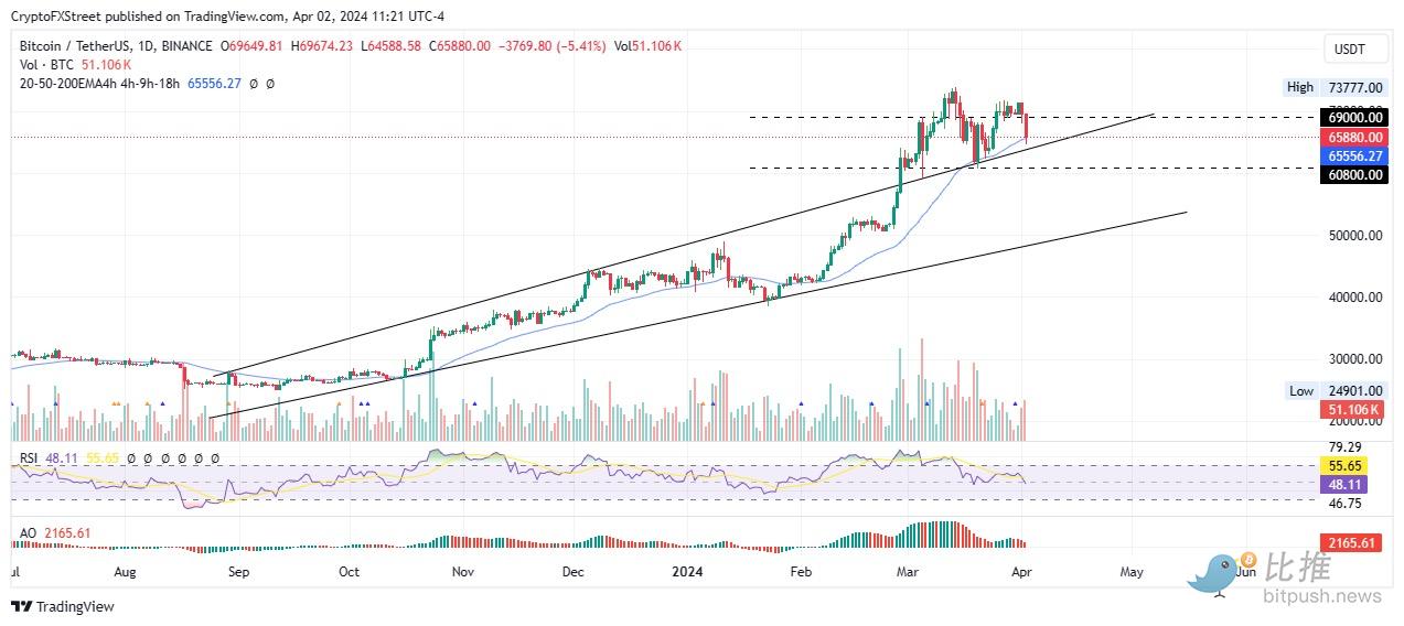 相反,如果 200 日均线保持支撑,比特币价格将反弹向上。突破 69,000 美元的支撑位将预示着更多的买单,从而增加了进一步上涨的可能性,第一个目标是收复 73,777 美元的峰值,然后才有机会在 74,000 美元区间上方创下新高。