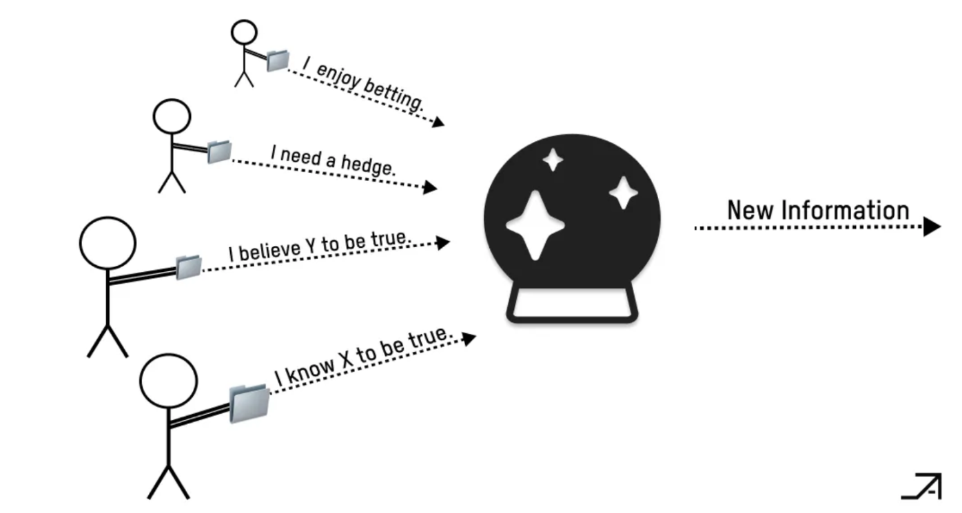 预测市场通过激励玩家使用自己的钱(如加密货币)来押注各种事件的结果来运作。这种需要个人承担财务风险(「真金白银参与」)的做法有助于确保参与者真正致力于他们的预测。随着交易者根据他们的洞察力采取行动,通过购买被低估的结果份额并出售被高估的结果份额,市场会动态调整。市场价格的这些调整反映了事件概率更准确的集体估计,有效地纠正了任何最初的错误定价。