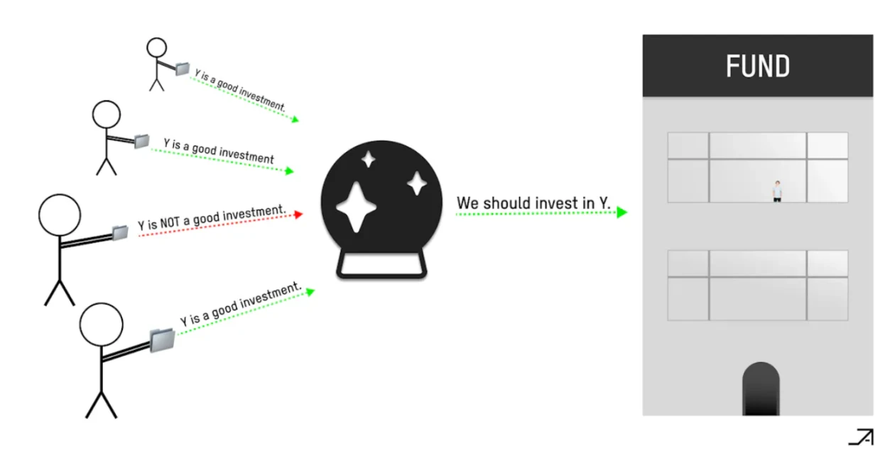 这些信息游戏会创建激励机制,从人、数据库和其他来源中提取原材料(公共和私人数据),然后通过最佳的信息生产机器(市场和算法)汇总这些数据。理想情况下,在汇总这些信息的过程中,会产生新的信息,并通过帮助其他玩家做出好的决定来实现货币化。例如,一个投资性 DAO 通过使用预测市场的结果来决定是否投资一家新的初创公司。
