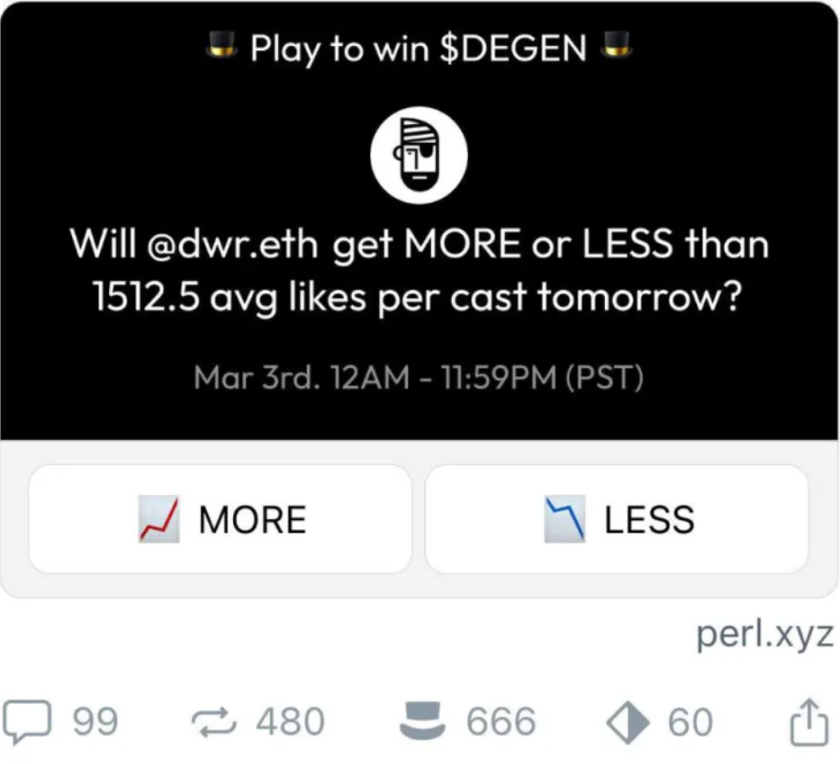 我们也看到了一些早期迹象表明,在某些情况下,玩家喜欢信息可信度保持期限可以被操纵的信息游戏。Perl 是 Farcaster 上当时排名第一的账户,它倾向于这种模式,并创建了一个应用程序内平台来推测用户参与度。诸如「明天 @ace 还是 @dwr.eth(分别为 Perl 和 Farcaster 的联合创始人)会获得更多点赞?」之类的预测市场被发起,足球队及其球迷可以预料到的「捣乱」也开始了。 只有在这里,游戏是异步进行的,衡量标准是点赞而不是 「Touchdown」 (Foresight News 注,通常用于描述美式橄榄球比赛中的得分动作,当进攻方将橄榄球带入对方的终区(end zone)并成功触地时,就会被判定为 Touchdown 得分)。虽然 Perl 的游戏有意破坏了预测市场产出信息的质量,但通过协调来解决对某人有利的预言,从而出现了一种有趣的元游戏。