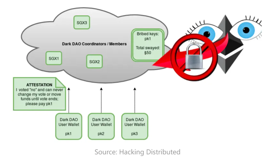 然而,要在少数玩家的赌注裁决中使这些预言机可靠仍然存在许多挑战,在这种情况下,识别彼此并进行交流以串通一气成为潜在威胁。虽然加密技术被吹捧为避免投票者之间串通的关键工具,但它也可以被用作实现串通并干扰预测市场的工具。我们可以通过 DarkDAO 利用可信执行环境(TEE)进行程序化贿赂和协调价格操纵的潜力看到这一点。 正在努力平衡这些激励措施的团队之一是 Blocksense,它使用秘密委员会选择和加密投票来防止串通和贿赂。