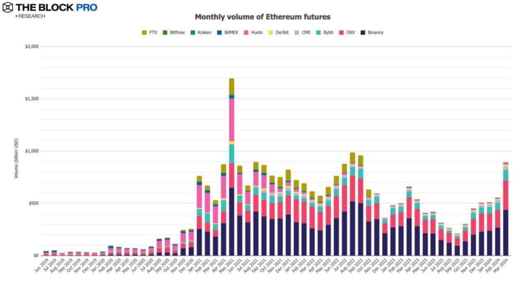 8. 加密期货方面,3 月比特币期货未平仓量上涨了 33.2%,以太坊期货未平仓量上涨 18.6%;期货交易额方面,比特币期货 3 月交易额成长达 80.8%,升至 2.02 兆美元。