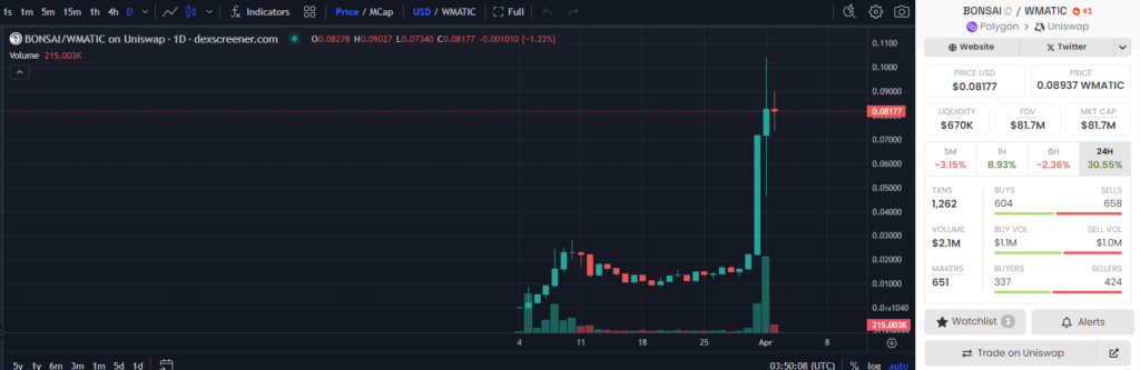 3 月的最后一天,基于 Lens 的 Meme 币 $BONSAI 𫔭始急剧拉升,市值从月初的 5M 拉到 80M,价格也在 2 天内翻了 4 倍左右,快速完成了最初的价值发现。