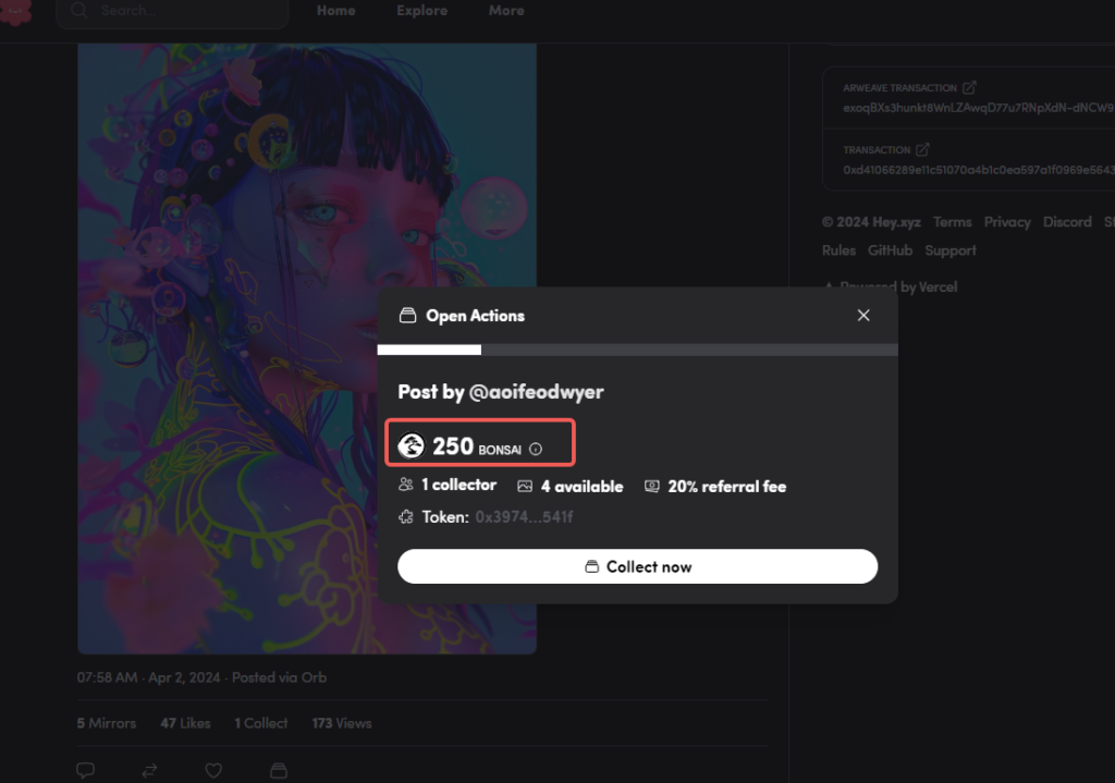 比如,如果你在 Lens 上的某个帖子中看到了一件 NFT 艺术品,Mint 时可以直接使用 BOSAI 进行支付。