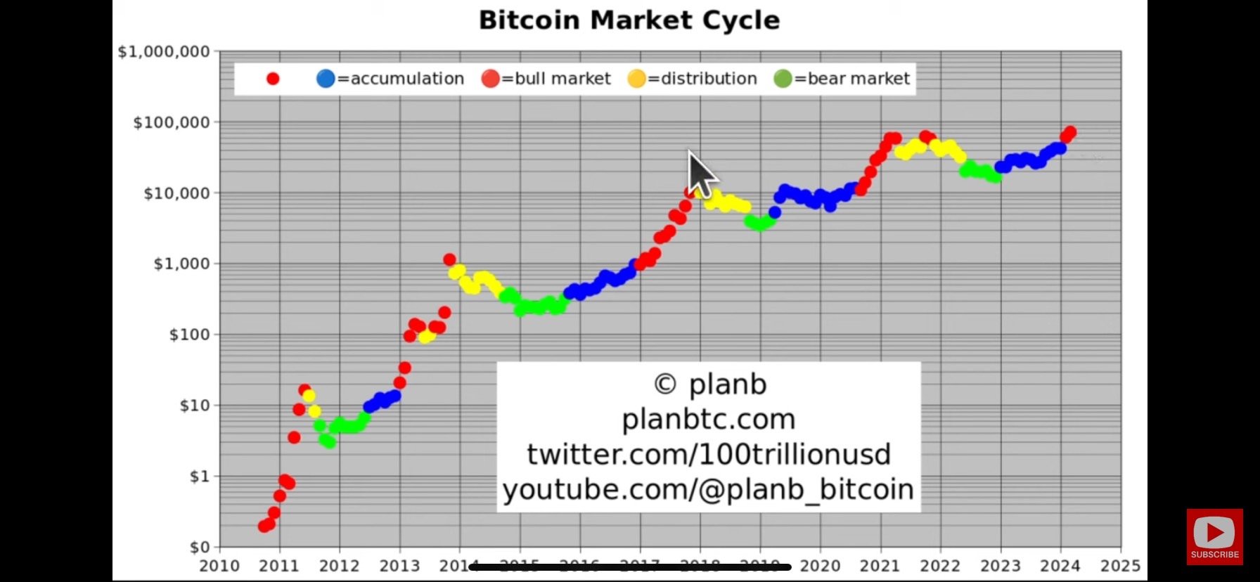 他提醒,市场虽会上涨,但途中不乏 20% 至 30% 的回调,这是正常现象。他透露自己将在接下来的 12 个月内不再进行任何操作(猜测 PlanB 为满仓的状态),直至市场从牛市阶段(红点)转向分配阶段(黄点)。