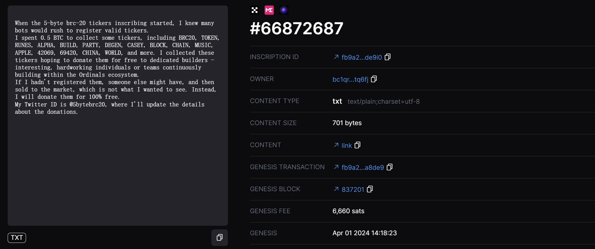 更有细心者发现,一位豪抢筹码的朋友在其钱包地址里刻下了 “我收集这些 ticker 的目的是希望将它们免费捐赠给专门的构建者——在 Ordinals 生态系统中不断构建的有趣、勤奋的个人或团队。”的铭文。