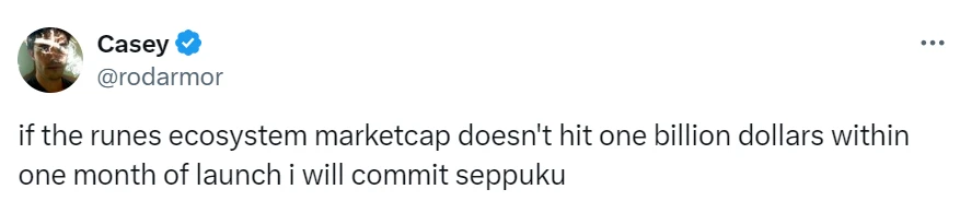 Casey 在社交平台表示:“如果符文生态系统的市值在发布后一个月内没有达到 10 亿美元,我将切腹自杀。”这个 10 亿美元目标实现的可能性大吗?