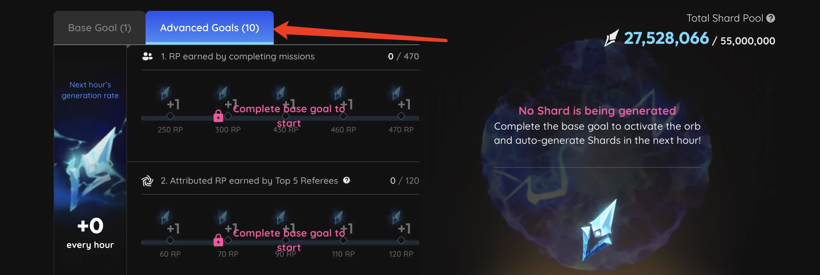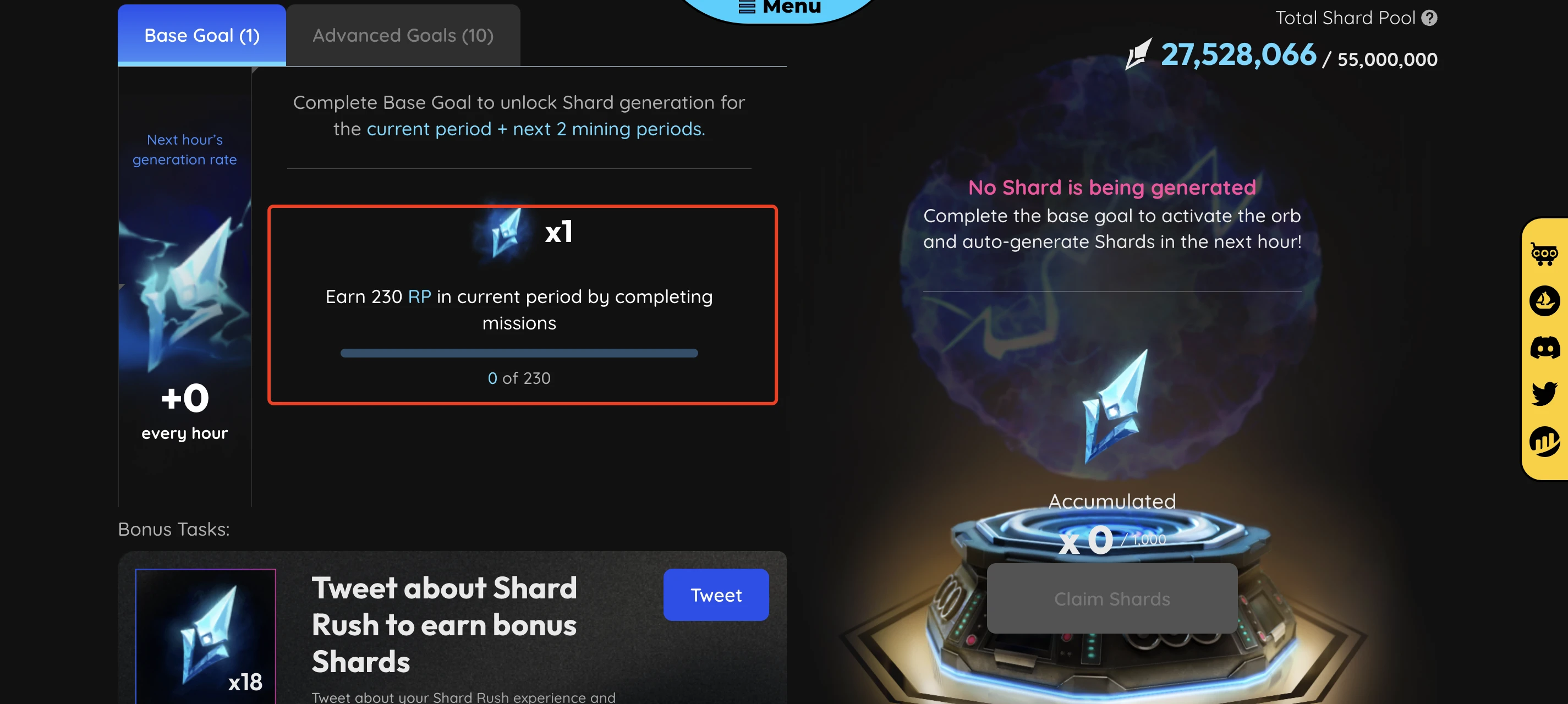 当账号 RP 数值达到 230 即可激活碎片挖矿,之后可通过完成更多任务解锁每小时碎片挖取速度。