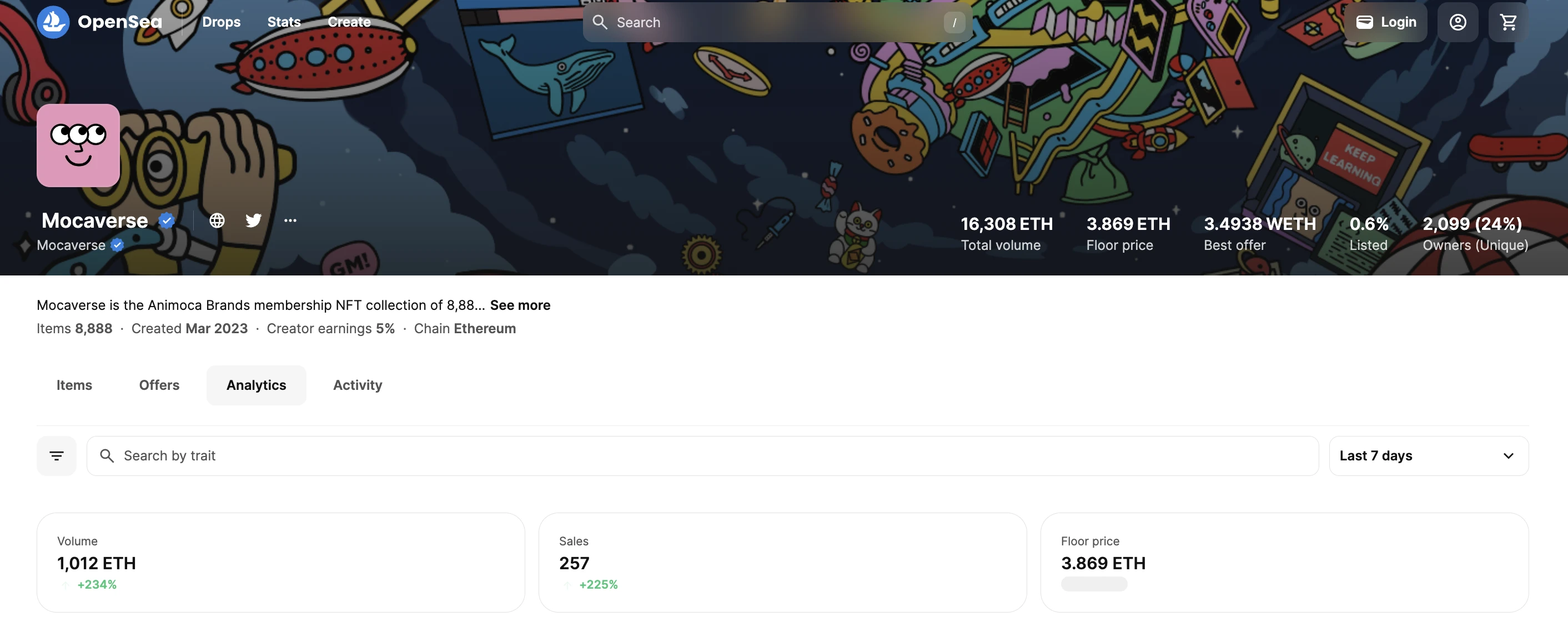 从去年下半年至今,以太坊生态 NFT 的行情始终冷淡,即便今年 BTC 突破历史新高,依旧没有带动起太坊生态 NFT。但是,就是在这样低迷的 NFT 行情下,Mocaverse 的地板价从 Mint 价格 0.069 ETH 一路上涨,最高在今年年初触及 6 ETH,最高收益率超 85 倍,目前地板价稳定在 3.9 ETH 附近,总交易量超 16000 ETH。