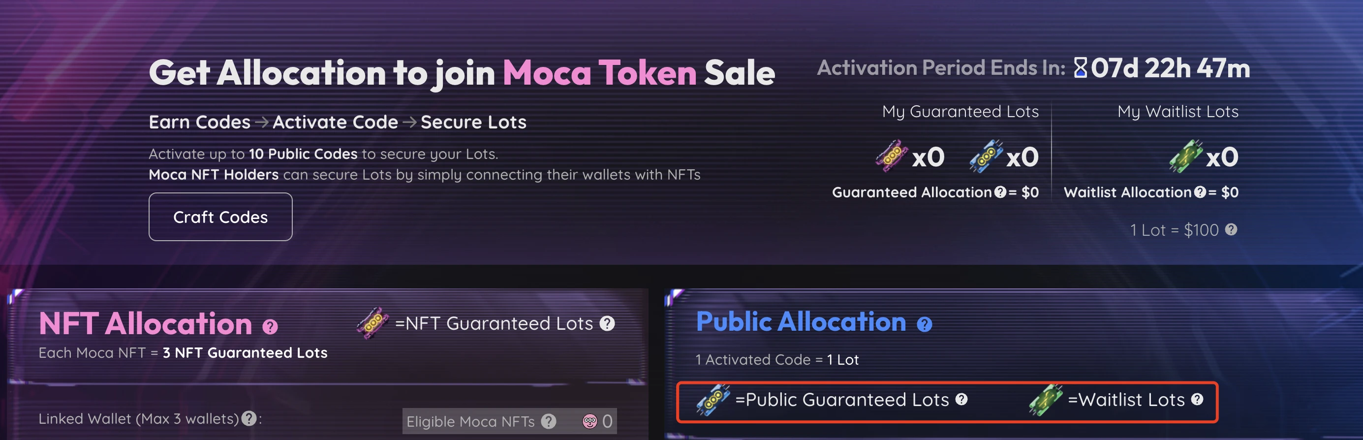 参与公售的先后顺序为:Moca NFT 持有者> 保证 Codes(蓝票) > 候补 Codes(绿票) > Moca ID 的其余部分用户。