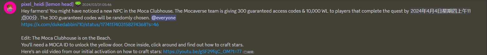 Pixels 抽奖活动: 300 个保证份额与 10000 个候补份额,参与方式需在 Pixels 游戏中寻找指定 NPC 完成收集“星星”任务,该活动将在 4 月 4 日结束。