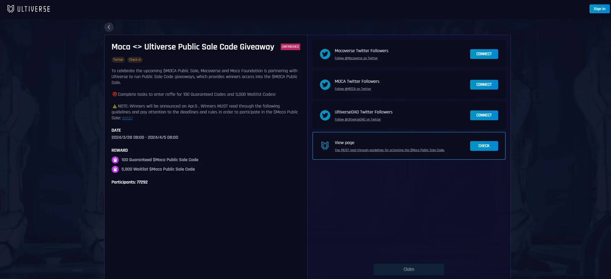 Ultiverse 抽奖活动: 100 个保证份额与 5000 个候补份额,参与方式在指定官网完成社交任务即可参与,该活动将在 4 月 5 日结束。