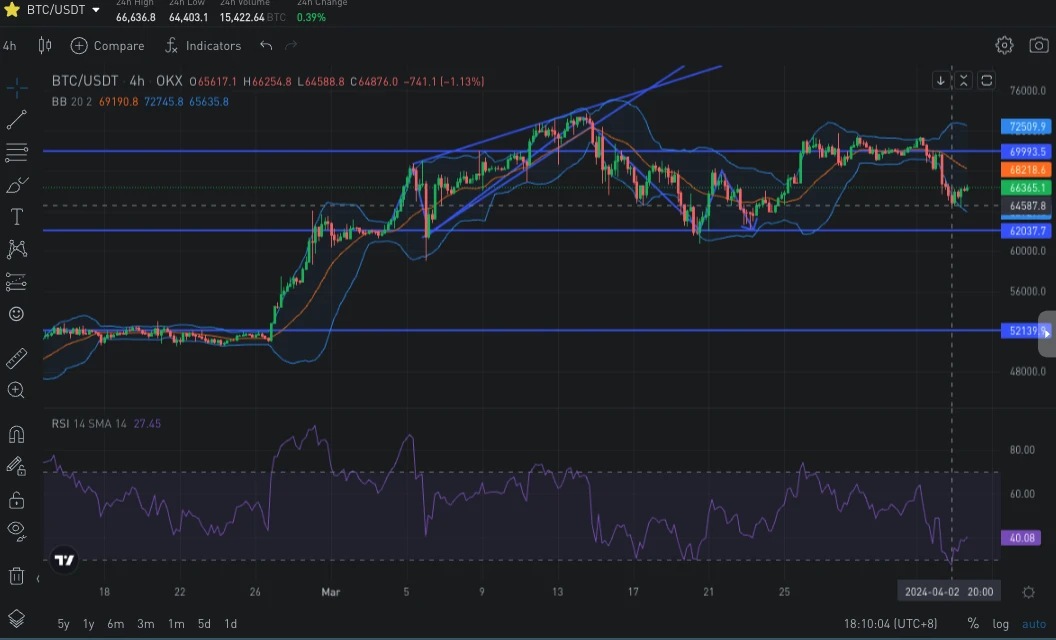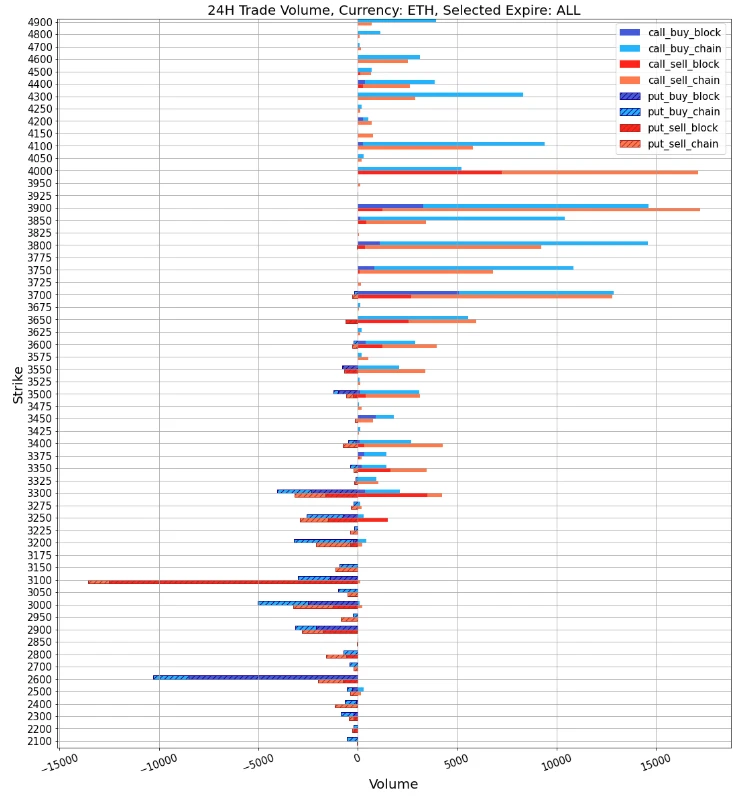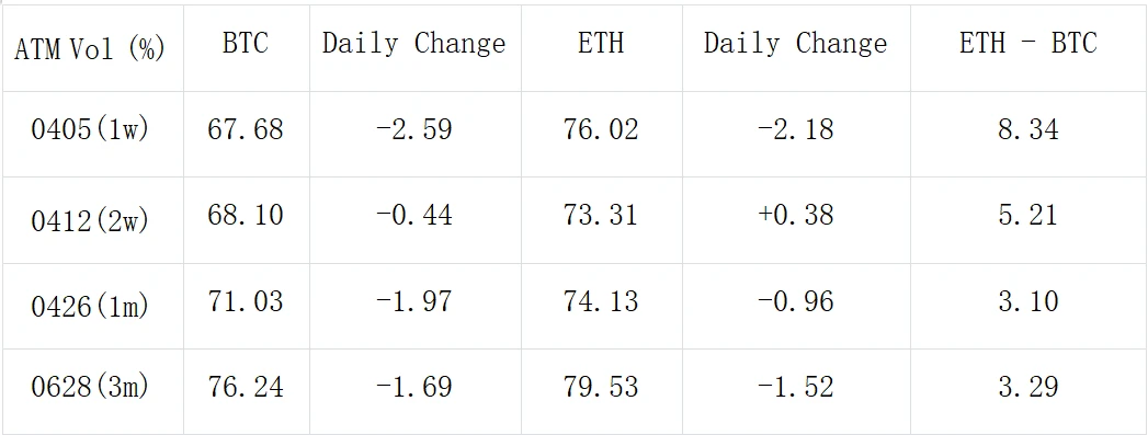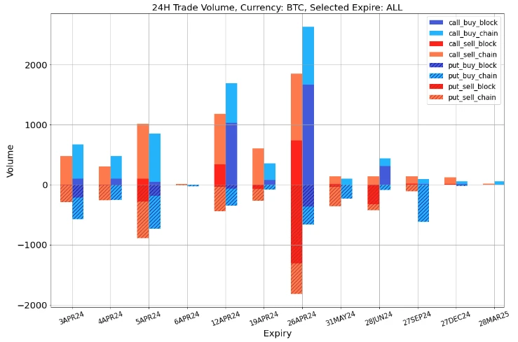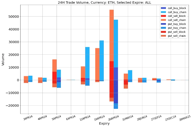 数字货币方面,BTC 价格在 65000 美元附近小幅反弹,期权波动率平行下滑,风险情绪有所回暖,过去一日 BTC 在 64000 和 60000 两道水位上出现大量看跌期权的抛售,与此同时 4 月底往后再度涌现出行权价在 70000 以上的看涨期权建仓。ETH 方面, 8500 组 26 APR 24 2600 vs 3100 卖出看跌价差成为市场关注焦点,且同样有大量看涨策略成交。