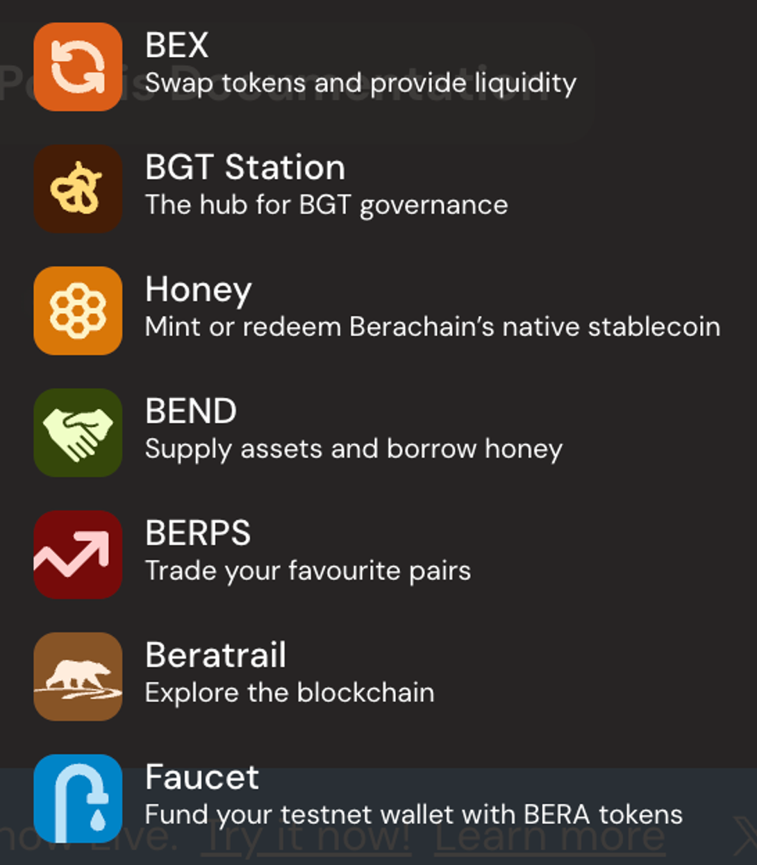除了 BEX、BEND 与 BERPS 外,官方还提供了基于 BGT 委托治理的管理平台 BGT Station、原生稳定币 HONEY 的铸造与赎回平台、Berachain 的区块链浏览器 Beratrail 以及测试网水龙头。