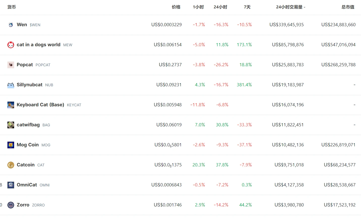 根据 CoinGecko 数据,截至 4 月 2 日下午 5 时,猫猫主题的 meme 币 24 小时成交量前十名的项目分别是:WEN、MEW、POPCAT、NUB、KEYCAT、BAG、MOG、CAT、OMNI、ZORRO。此外,ORCAT 项目因为 BOME 的顶级持有者的参与也吸引了广泛关注。本文 PANews 将简单介绍一些亮点猫系 meme 项目,它们会取代狗狗 meme 占领生态吗?